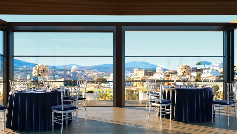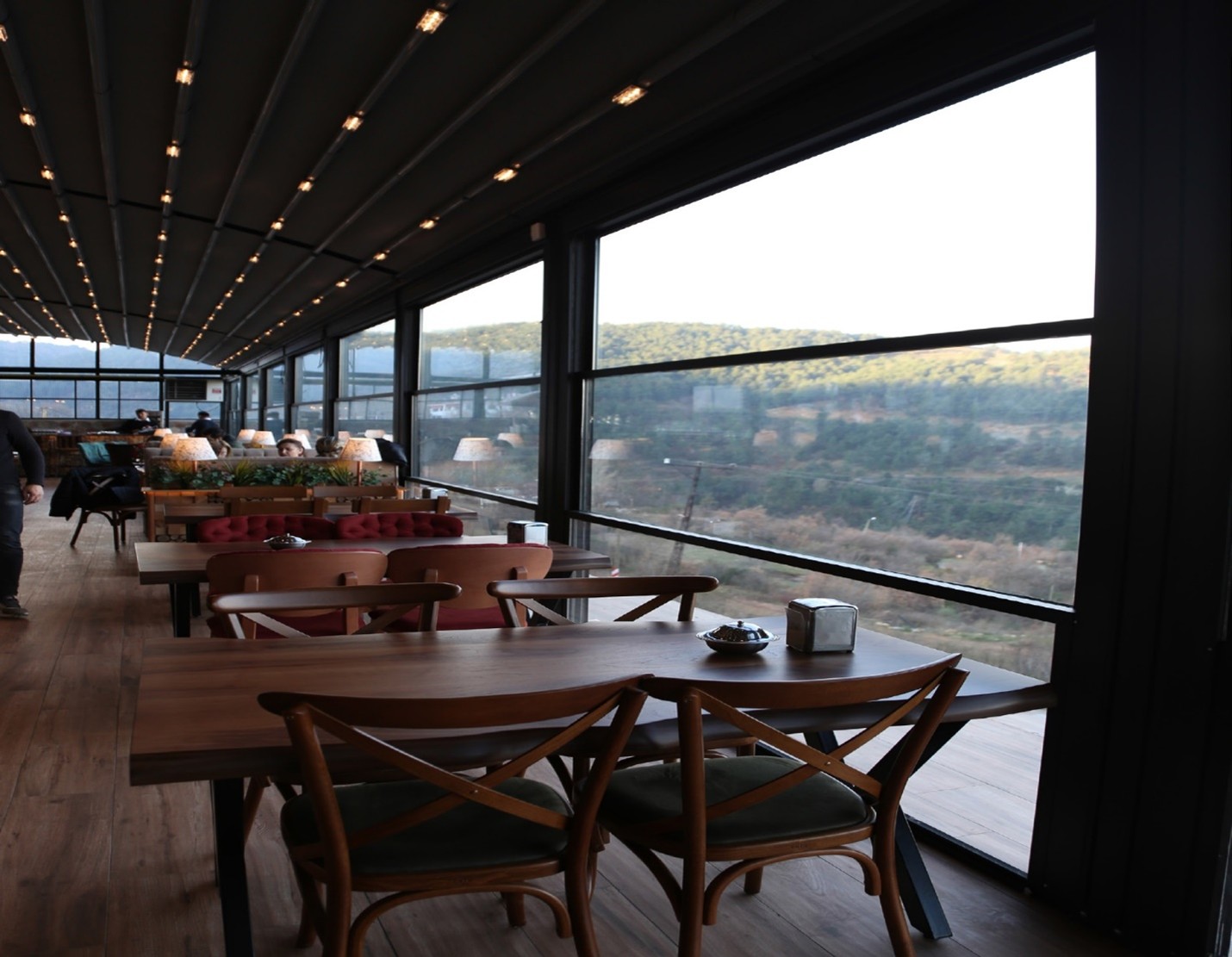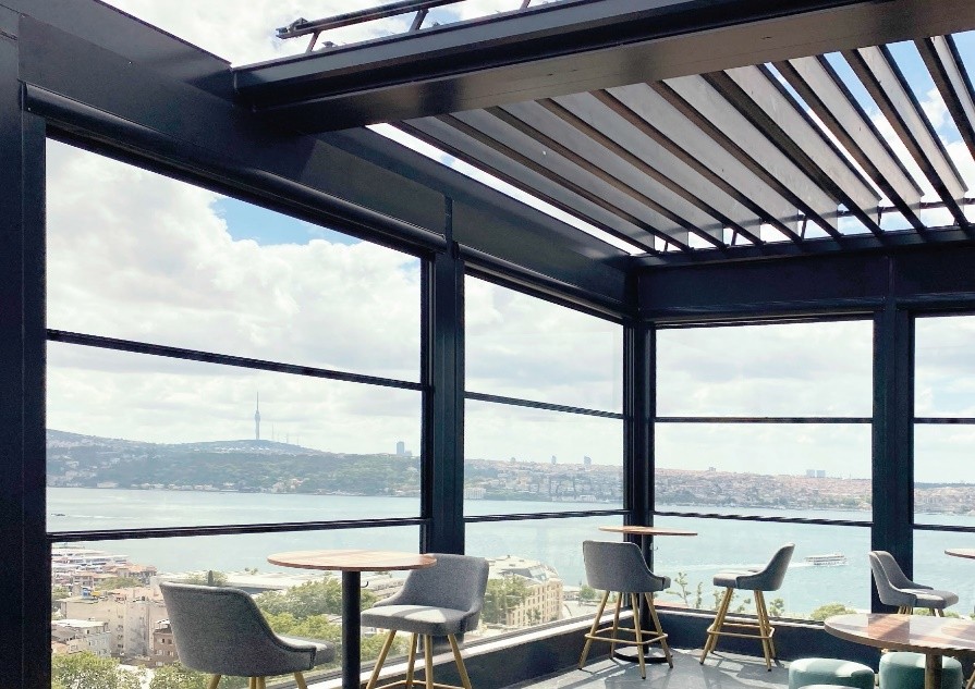 پنجره گیوتینی کاربرد گسترده ای در فضاهای تجاری مانند فروشگاه ، رستوران ، کافی شاپ و فست فود دارند. تراس این مکان هایک محل جذاب برای مشتریان می باشد که ترکیب پنجره گیوتینی با سقف متحرک پارچه ای جذابیت ان را دوچندان می نماید.