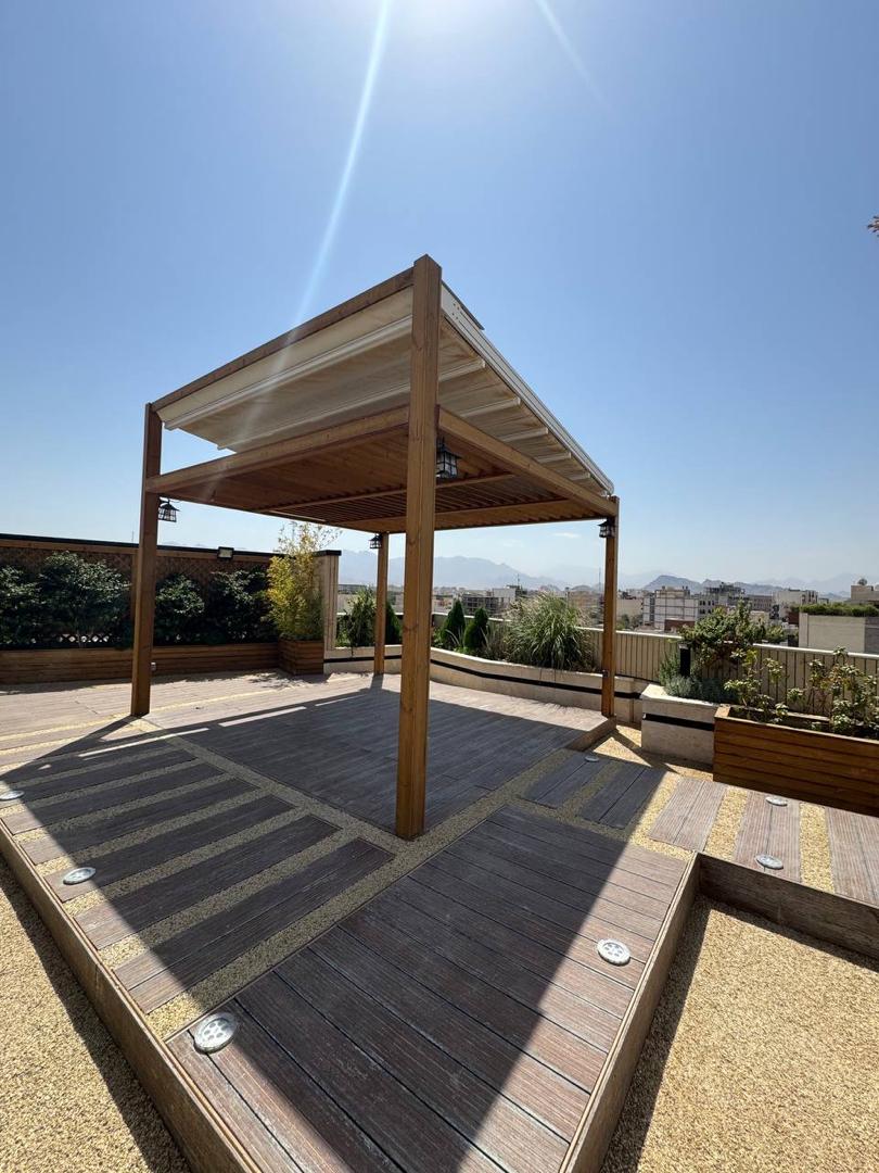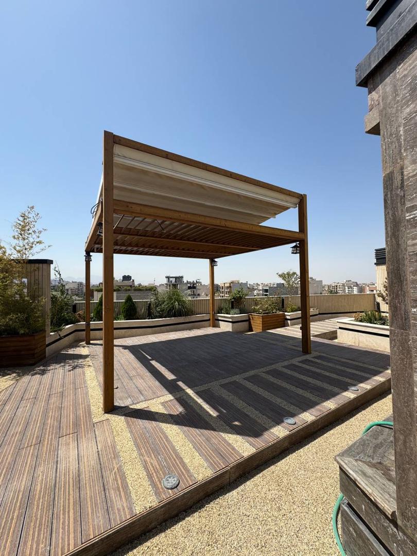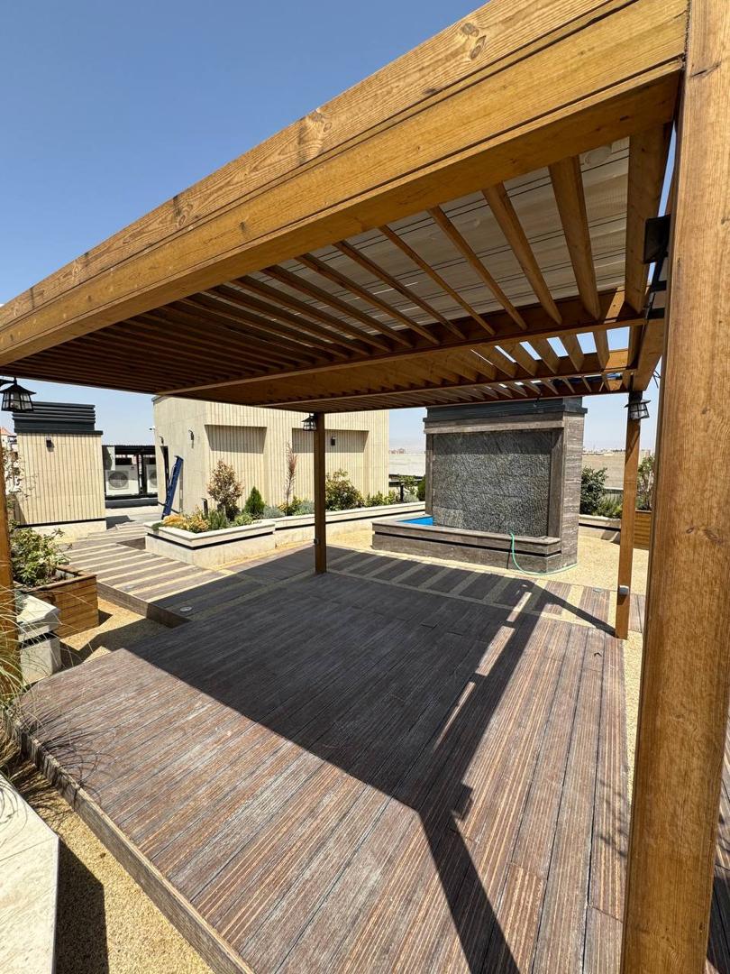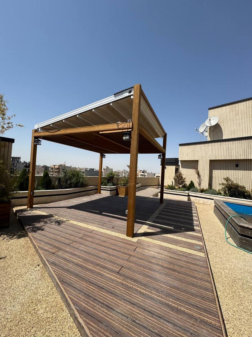 • نوع سازه: آلاچیق چوبی (پرگولا) با پوشش سقف متحرک پارچه‌ای