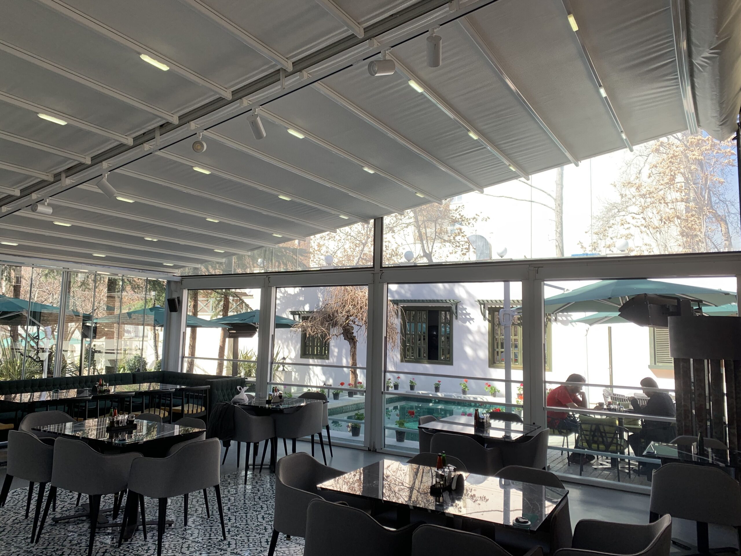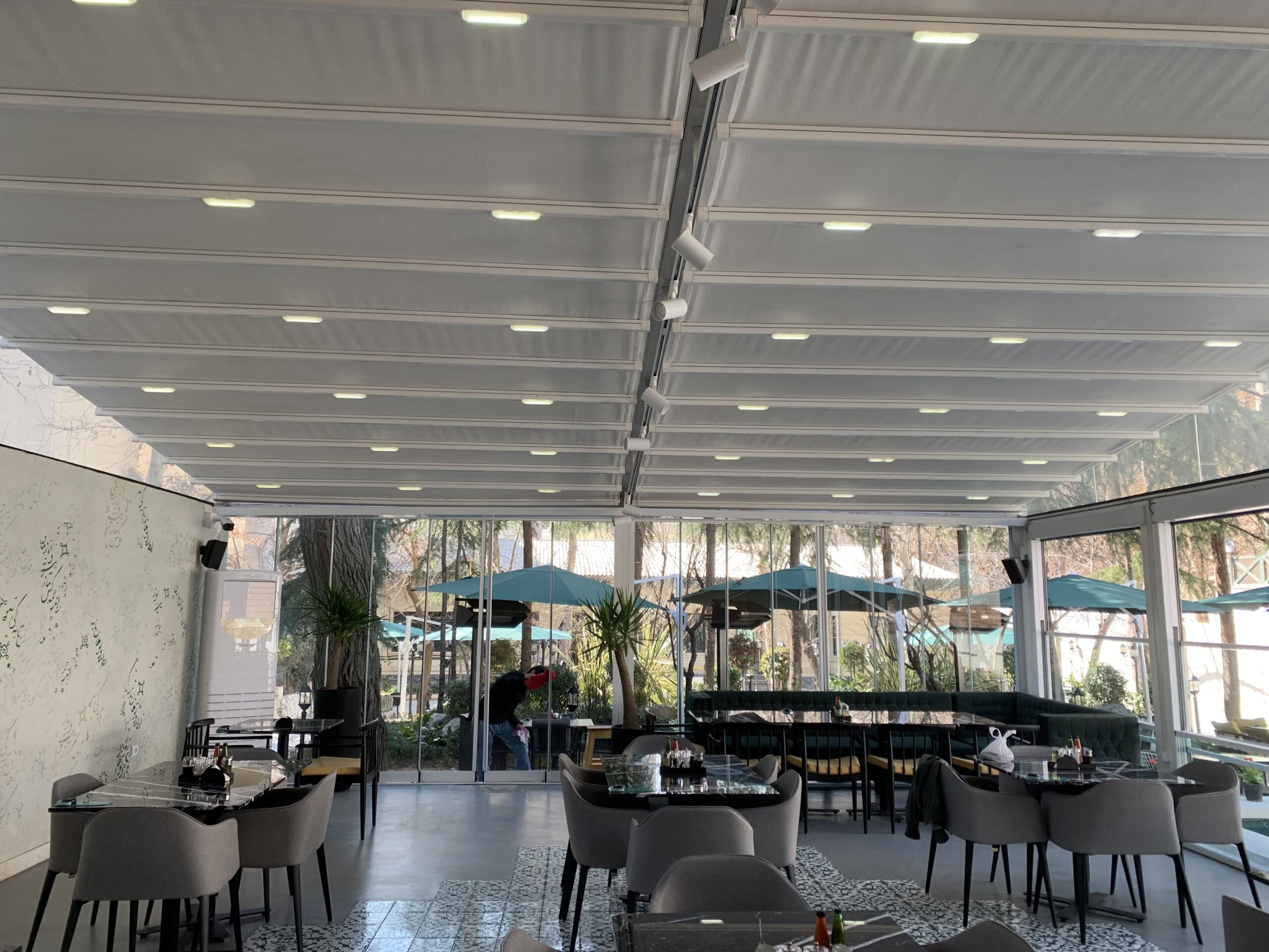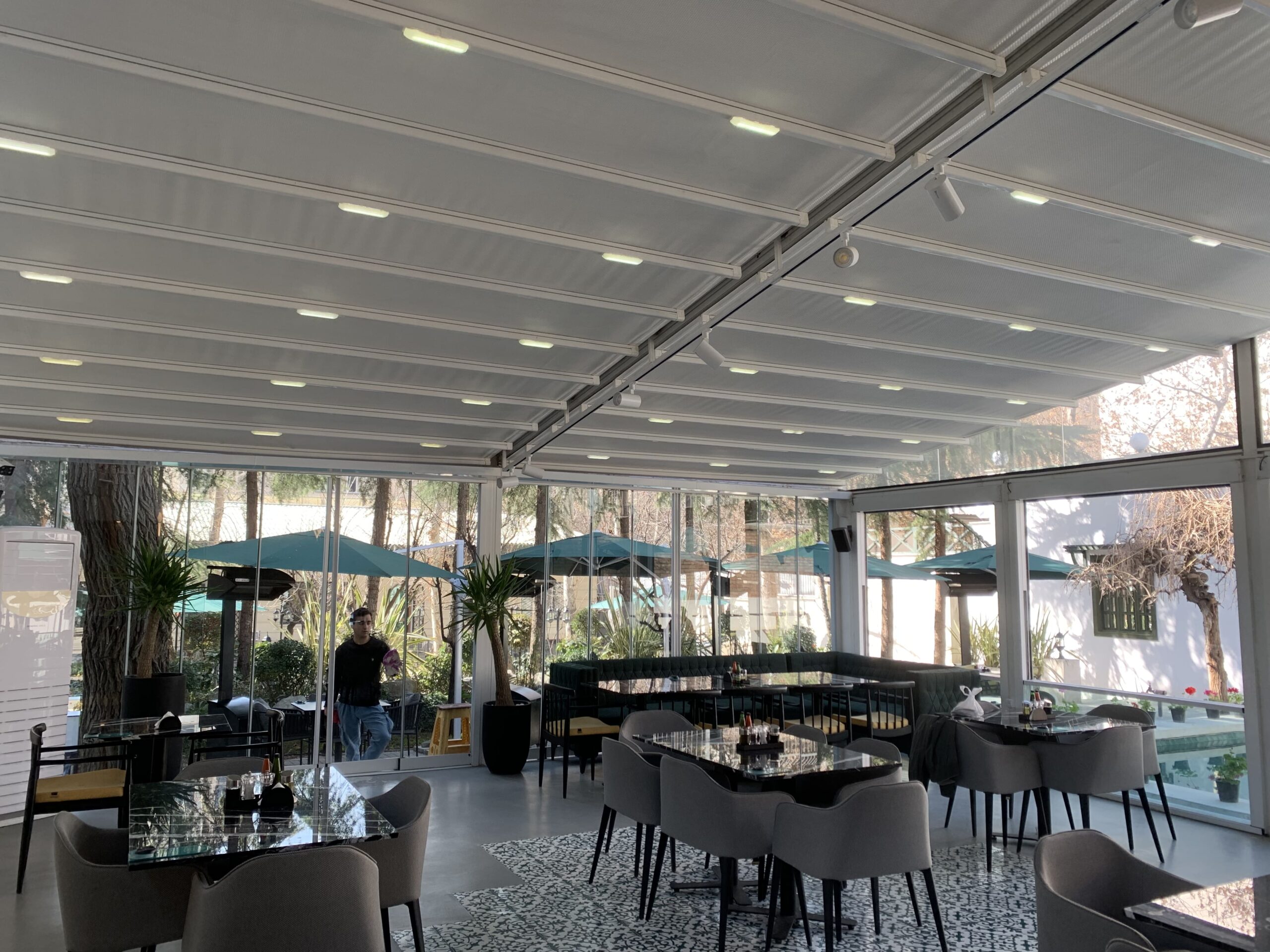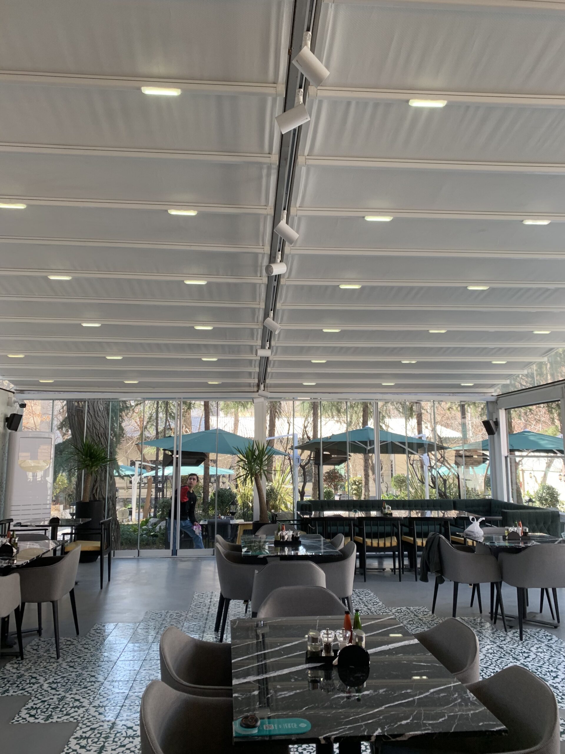 3. محافظت در برابر عوامل جوی: پارچه‌های بلک‌اوت و سیستم‌های آب‌بند و هوا‌بند سقف متحرک، از فضای داخلی در برابر باران، باد و نور مستقیم خورشید محافظت می‌کنند و فضایی آرام و دلنشین را برای مشتریان فراهم می‌آورند.