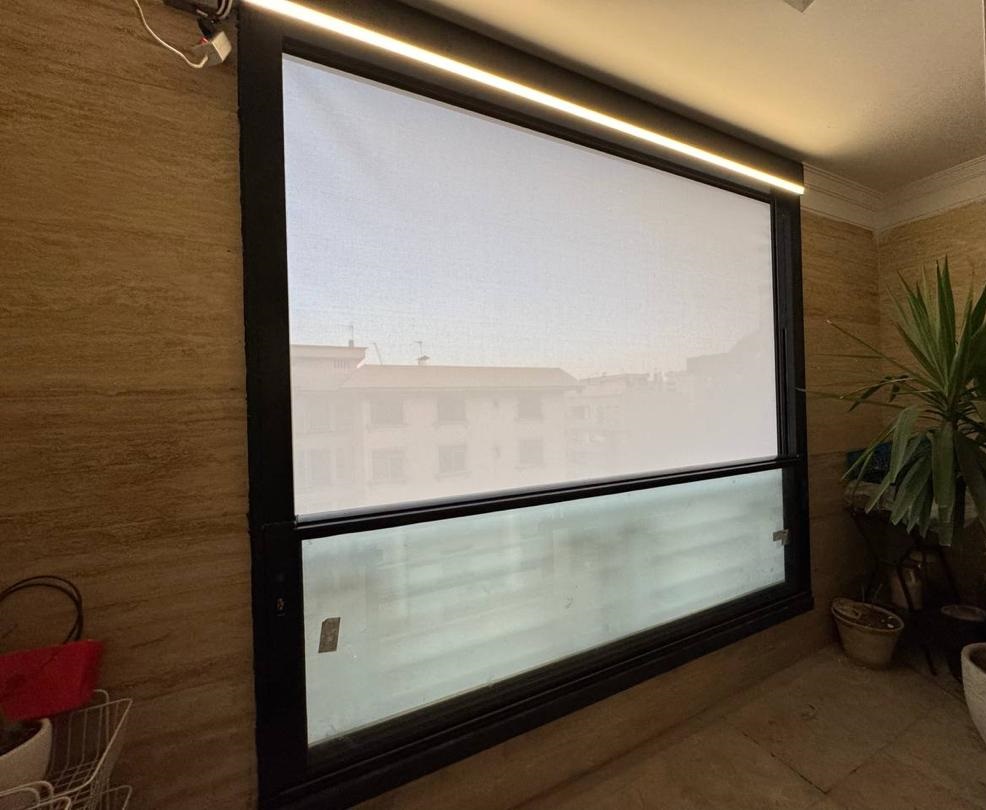 اجرای یک دستگاه پنجره گیوتینی مدل تمیز شونده با شیشه لمینت سوپرکلیر و زیپ پرده برقی با پارچه سان اسکرین به رنگ نخودی.